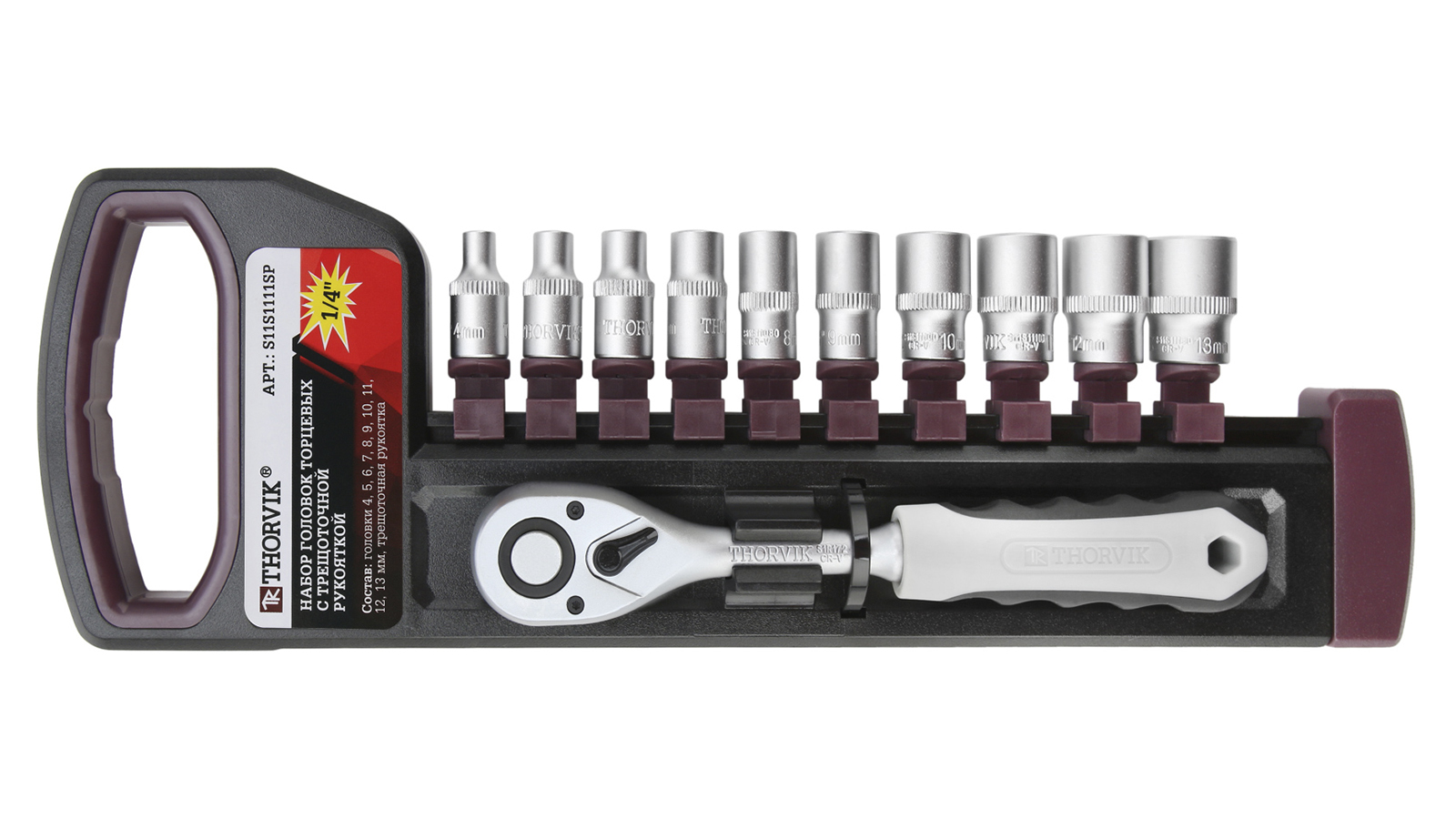 Набор головок THORVIK комплектуется торцевыми шестигранными головками и трещоткой.