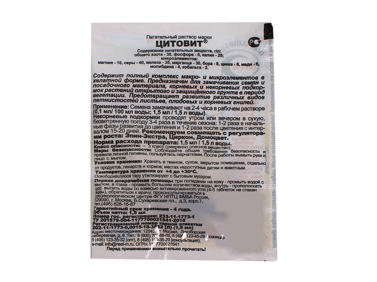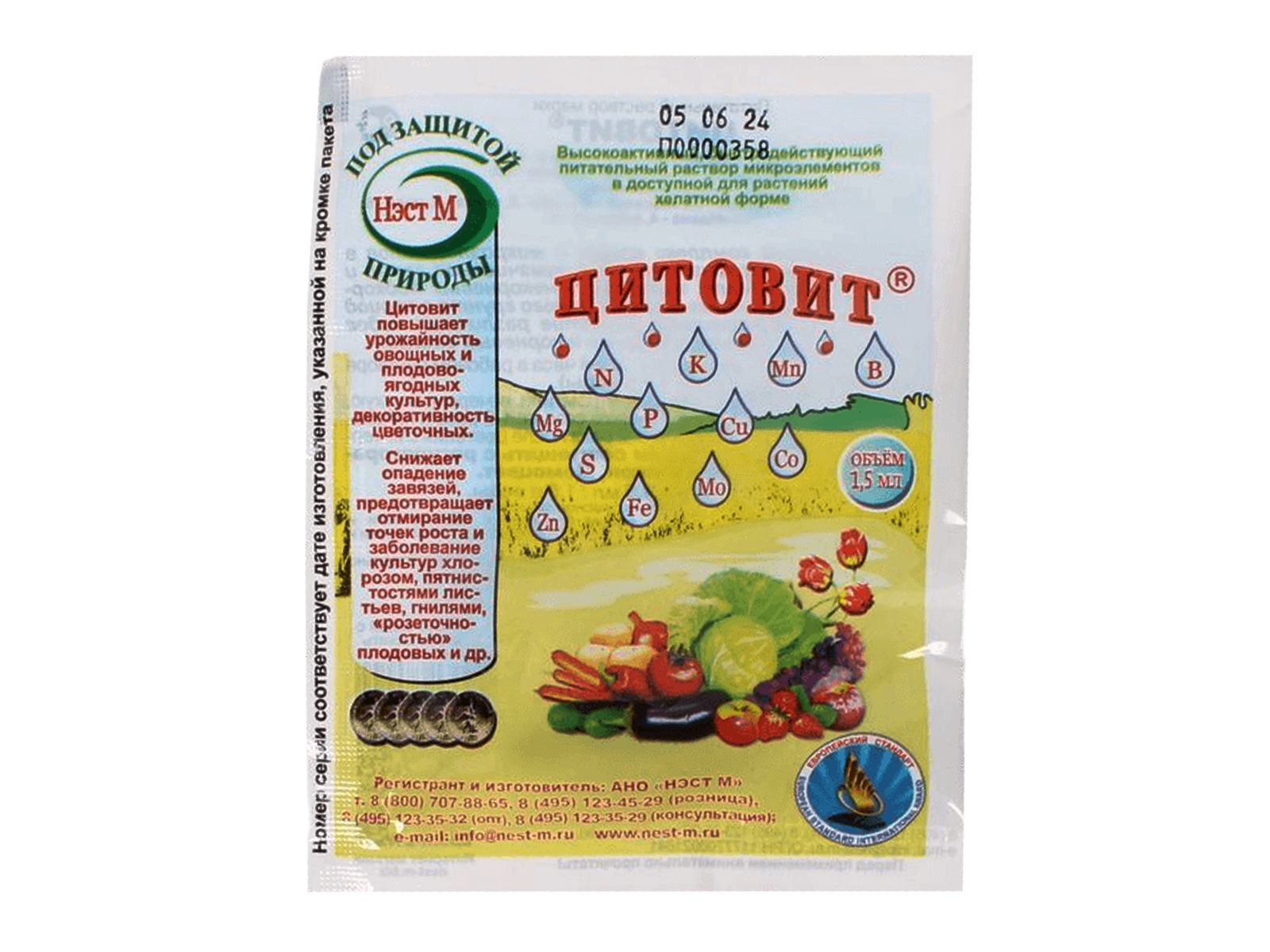 Цитовит - высококонцентрированный сбалансированный комплекс всех жизненно важных макро- и микроэлементов в доступной для растений форме. Он восполняет недостаток необходимых элементов питания и помогает растениям при заболеваниях, вызванных дефицитом микроэлементов.
